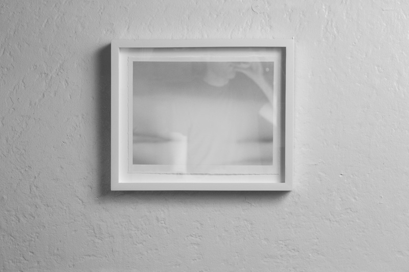 Black-and-white photographs of delicate abstract watercolors with things reflecting in the glass for a cheeky show catalog.
